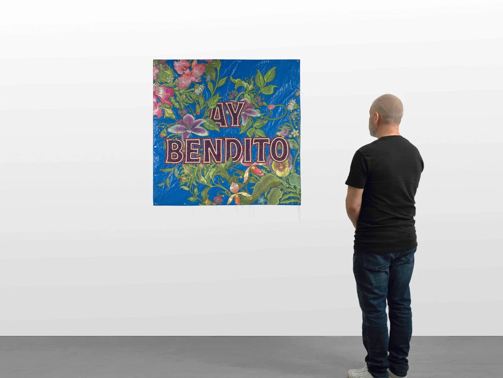 The Index of the Event: Carlos Rolón transforms the scarred blue FEMA tarp—a ubiquitous symbol of disaster and failure—into a vibrant artwork. The underlying Trauma Provenance of the material is layered with beauty, anchoring the piece's value in its Functional Obligation to aid rebuilding efforts.