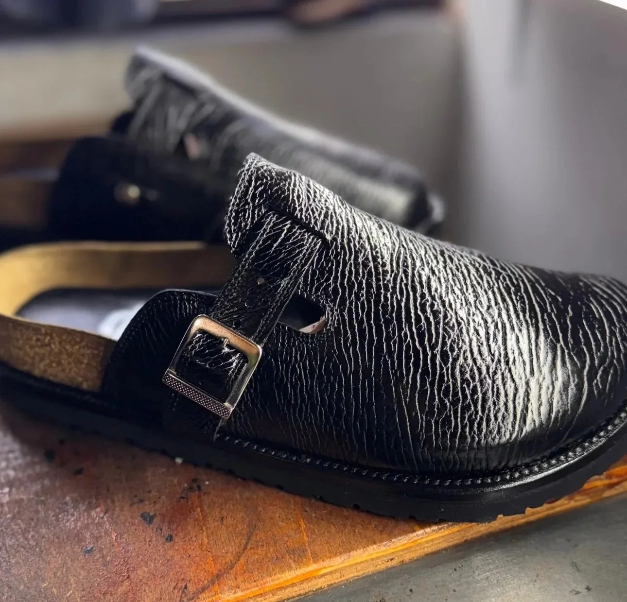 The Noir Sand Shark Mule serves as the definitive internal case study for the Haptic Resistance metric. In the age of the Smooth—the aesthetic of the digital, the optimized, and the frictionless—the Mule introduces a violent texture. The Noir Sand Shark leather is chosen for its micro-topography of fine placoid grains. This surface functions as a Fissure in the digital spectacle because it resists the touch-screen aesthetic.