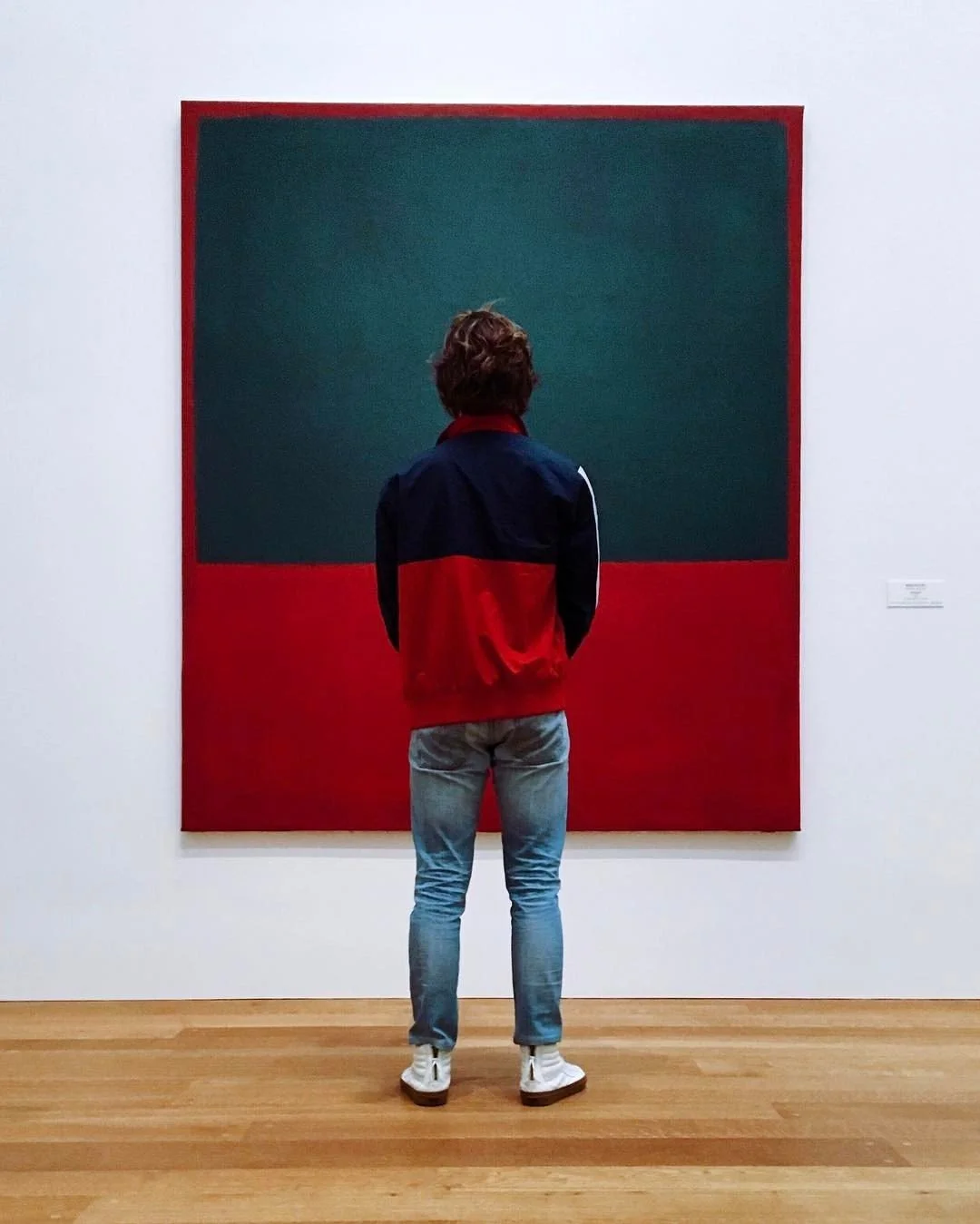 Utility as Concept, The Immersive Ritual: A viewer stands before a monumental Mark Rothko Color Field painting, demonstrating the artist's strategic use of scale to create an "intimate and human experience." This direct, confrontational engagement forces the viewer to be "dominated" by the canvas, transforming the gallery space into a "secular chapel" where the painting's utility is to facilitate a participatory ritual. This exemplifies Rothko's vision of P.L.C.F.A., where the emotional and conceptual function of art supersedes all else.