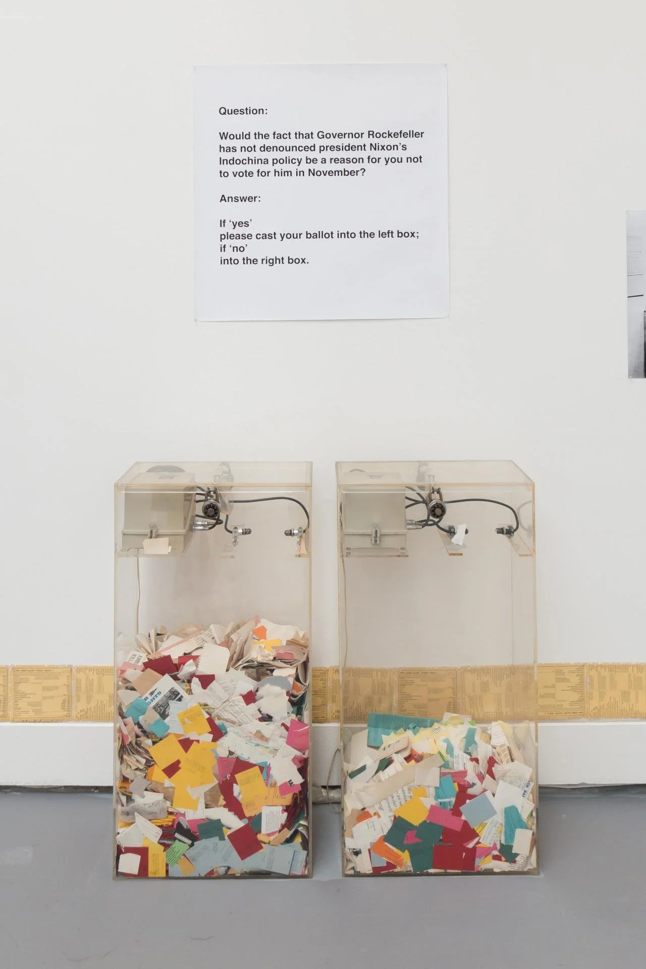 Hans Haacke's 1970 'MoMA Poll' exemplifies early Institutional Critique, directly exposing political and economic networks by asking museum-goers about their voting intentions, creating essential productive friction.