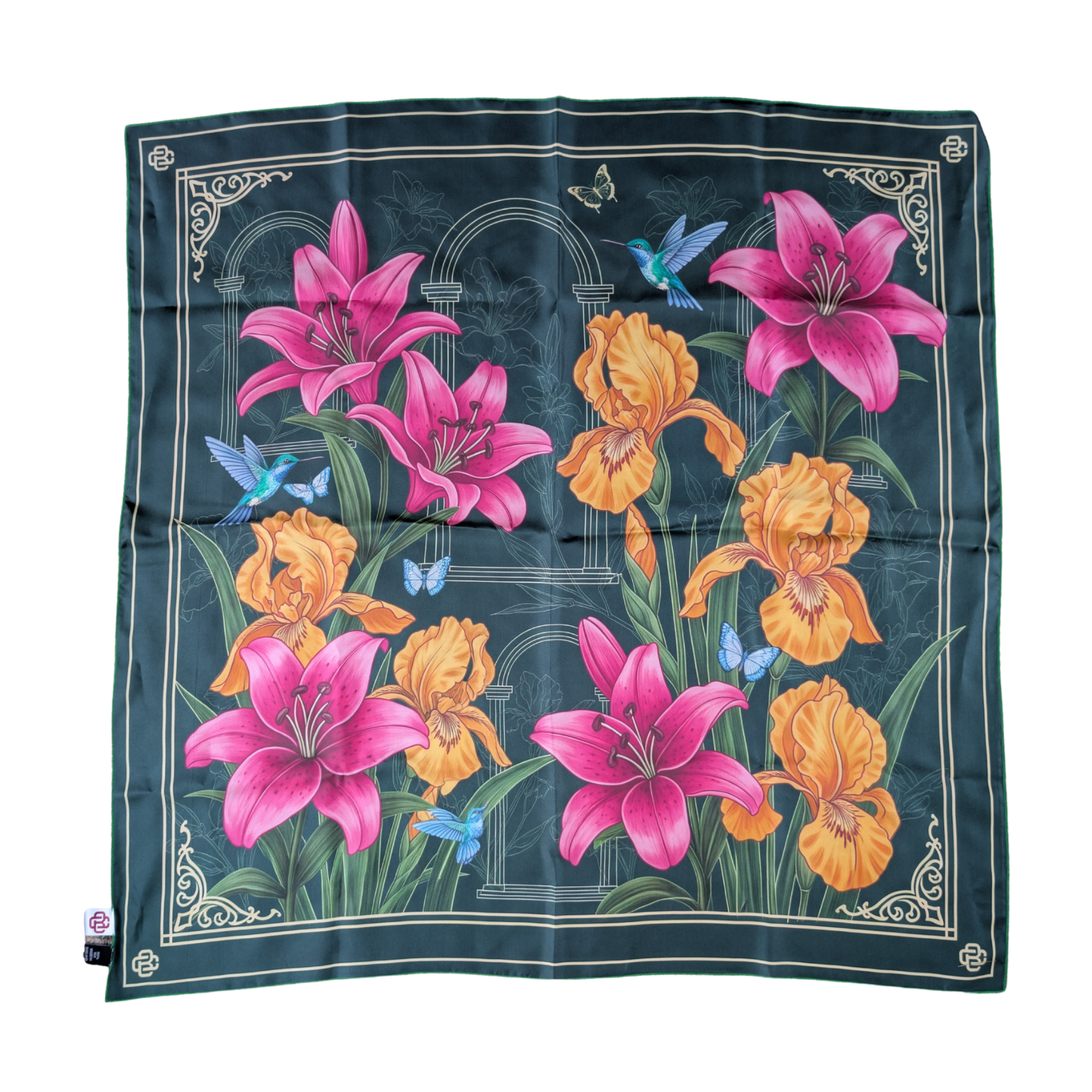 One celebrated example, The Garden of Art: A Woven Memoir in Silk, distilled this ethos in a singular gesture. Conceived not for a client but as a gift to his mother, it became the benchmark for the entire practice. A silk carré, hand-rolled on Savile Row, dyed in Como, and painted in Verona, it embodied the fusion of memory, material, and mastery. The scarf was not simply wearable but ritualistic: its presentation demanded that the narrative be absorbed before the object was unveiled. The result was an object inseparable from story—devotion made manifest.